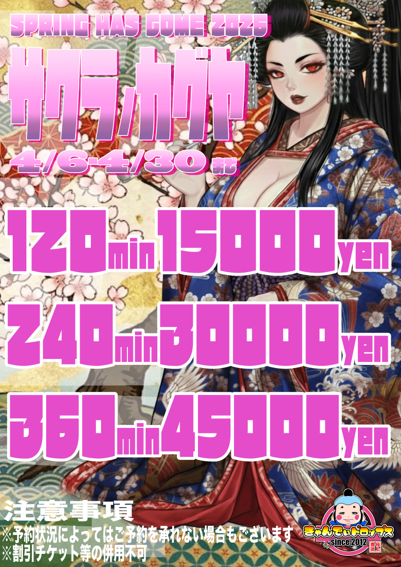[04/06 00:00]SPRINGHASCOME第一弾 ”サクラノカグヤ” 春の特別イベント第一弾 "サクラノカグヤ" ”春の倍カグヤ” 桜の季節は大好評の倍カグヤでお出迎え! もちろん1…